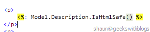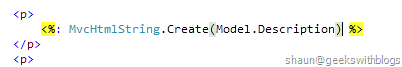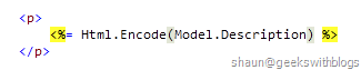 If you have been using ASP.NET MVC 1 or in .NET 3.5 world it would be very common that using <%= %> to show something on the page from the backend code. But when you do it you must ensure that the string that are going to be displayed should be Html-safe, which means all the Html markups must be encoded. Otherwise this might cause an XSS (cross-site scripting) problem. So that you’d better use the code like this below to display anything on the page.