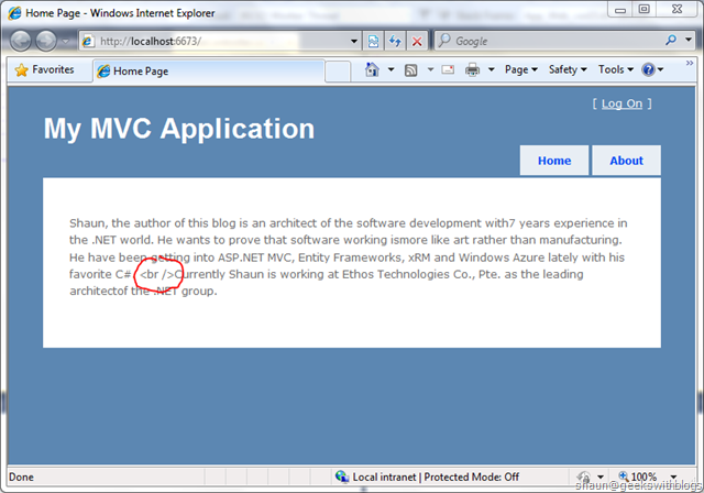 One of my colleague and friend, Robin is playing and struggling with the ASP.NET MVC 2 on a project these days while I’m struggling with a annoying client. Since it’s his first time to use ASP.NET MVC he was meetings with a lot of problem and I was very happy to share my experience to him. Yesterday he asked me when he attempted to insert a <br /> element into his page he found that the page was rendered like this which is bad.